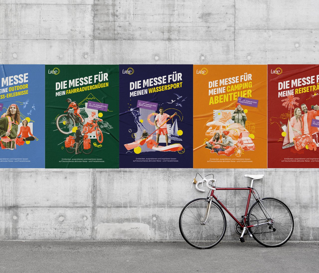 The new brand identity of f.re.e places the emotional experience of leisure and travel at its core – inspired by the trend of scrapbooking. The result is a flexible, modular design system that stages the fair as a visual journey: vibrant, personal, and full of memories. Five color-coded themed worlds – from outdoor and water sports to camping – structure the offering. Tape, scribbles, and torn edges create a collage aesthetic, while angled headlines convey direction and dynamism.