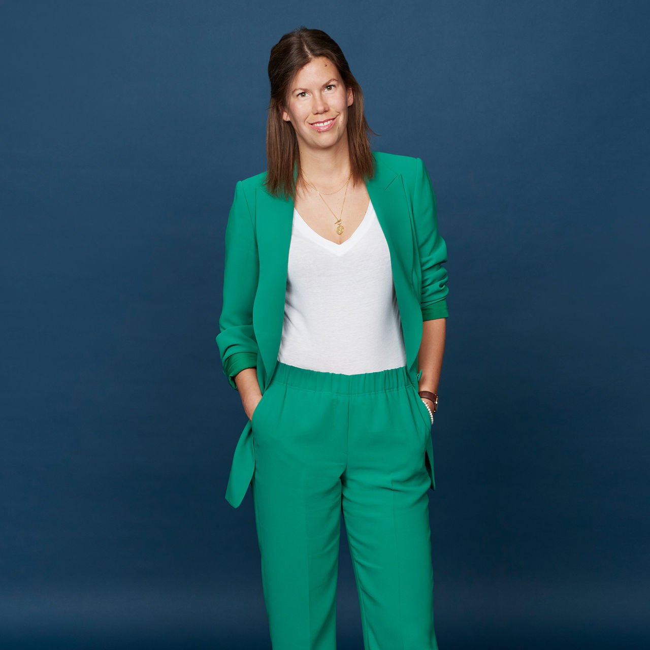 A woman with shoulder-length brown hair stands in front of a blue background, wearing a bright green pantsuit with a white V-neck top, her hands casually in her pockets, and smiling slightly at the camera.