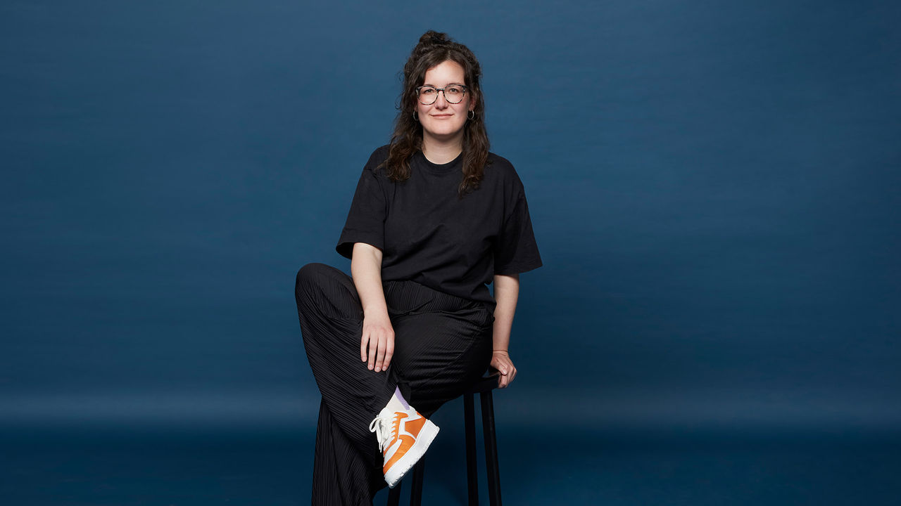 A woman with shoulder-length curly brown hair sits on a stool in front of a blue background, wearing a black T-shirt, black wide pants, orange and white sneakers, and glasses, smiling subtly.