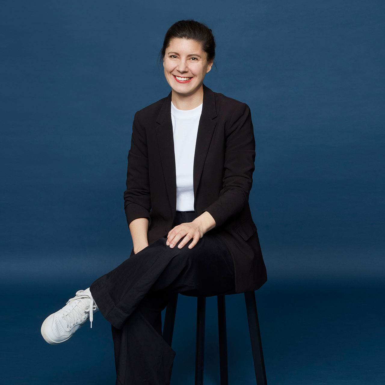A woman with dark hair tied back sits smiling on a stool in front of a blue background, wearing a white T-shirt, a black blazer, wide black pants, and white sneakers, with her legs crossed casually.