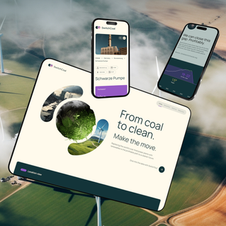 SwitchCoal - Several digital devices display the website with the slogan 'From coal to clean. Make the move.' in the foreground. Wind turbines stand on a green field in the background, symbolizing the transition from fossil fuels to renewable energy. The website and devices represent environmentally friendly technologies and sustainable energy sources.